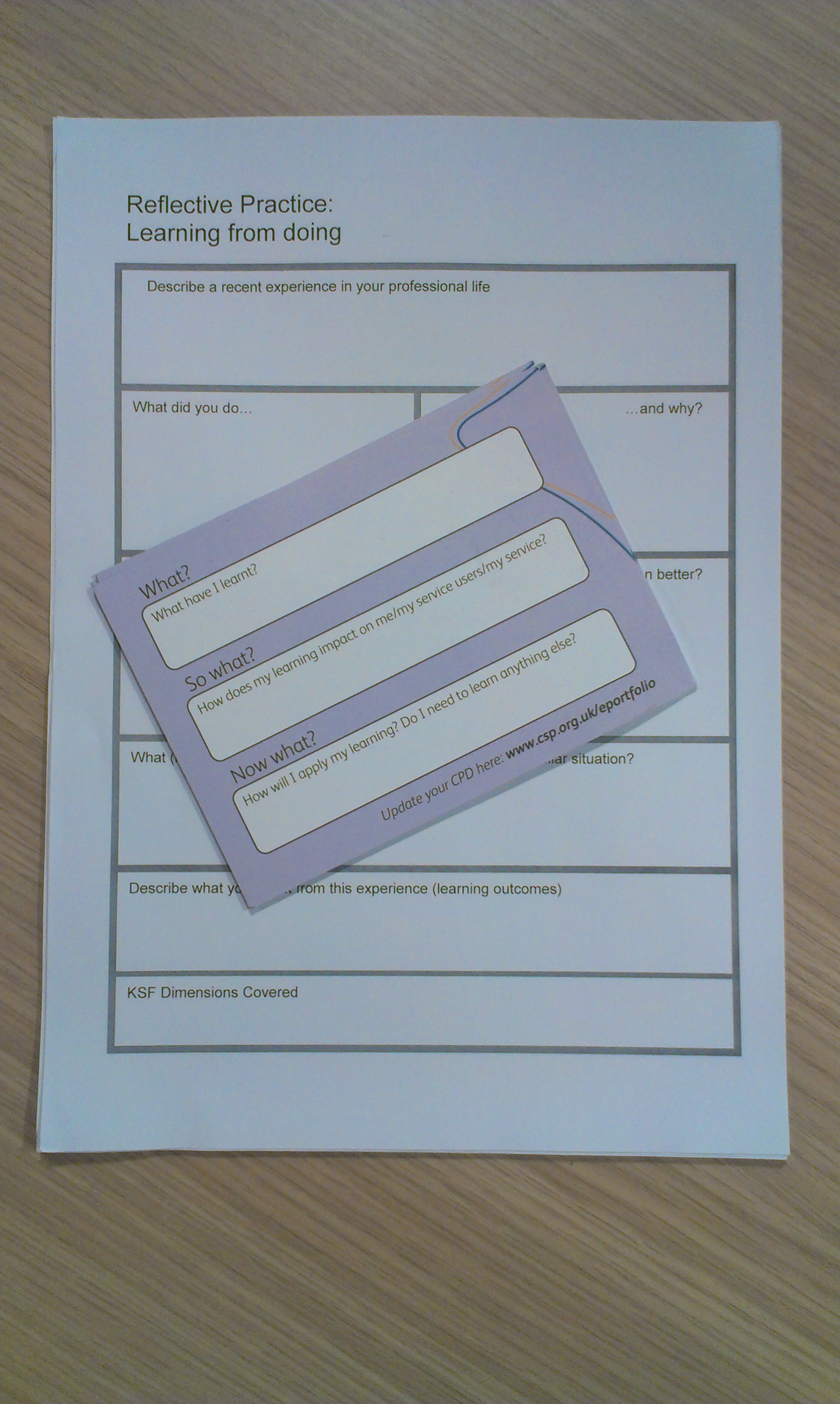 There was quite a lot of interest in the CPD postcards produced by @theCSP. These are handy sized cards to note down CPD activity and reflection (see photo below, along with my paper reflection form!). The postcards were produced by the Championing CPD team at the Chartered Society of Physiotherapy, copies can be ordered by emailing ChampioningCPD@csp.org.uk.