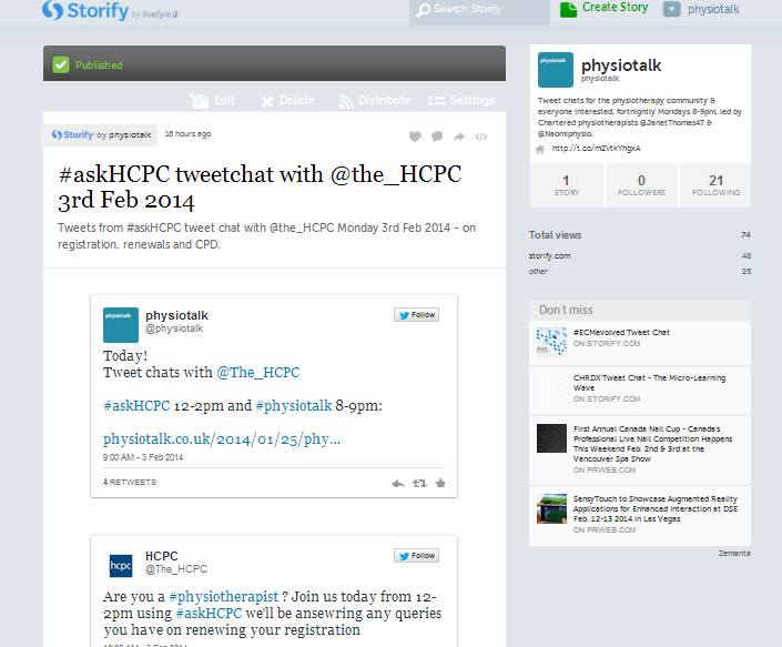 The first chat took place at lunchtime, hosted by @The_HCPC, and was a brilliant opportunity to ask HCPC staff ‘live’ questions about registration, renewals and CPD – most of the tweets from the chat are in the physiotalk Storify which you can read by clicking here.