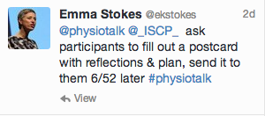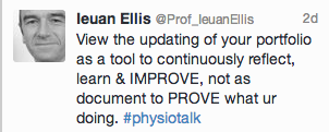 The physiotalk chat on twitter reminded me that I don’t need to be overwhelmed. If I focus on capturing my practice on a regular basis, those small insights, those comments from a colleague or patient, those thoughts during a conference, postcard reminders, high points and low points. These pave the way for progress and change. It wouldn’t be realistic to expect that every experience we reflect upon, everything we read, observe and learn will lead to a transformation in practice. But if we don’t record what we notice, observe and read and experience, our brains can struggle to aggregate the memories that would help us to notice patterns, identify gaps and give reliable assessments of our performance. It’s a cumulative process and as another tweeter mentioned, great impact can be gained and transferred through effective role modelling of this cumulative sustained action.