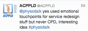 This was my first #physiotalk and my first tweetchat! I have been a consumer on twitter for a while but I have only recently started actively tweeting and connecting. This part of my own mini ‘action research’ project to explore the values and risks of social media.