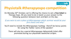 If you haven’t booked a place yet you will also be able to take advantage of the special #therapyexpo #physiotalk ticket offer we will be promoting during the tweetchat on Monday 26th October at 8pm.