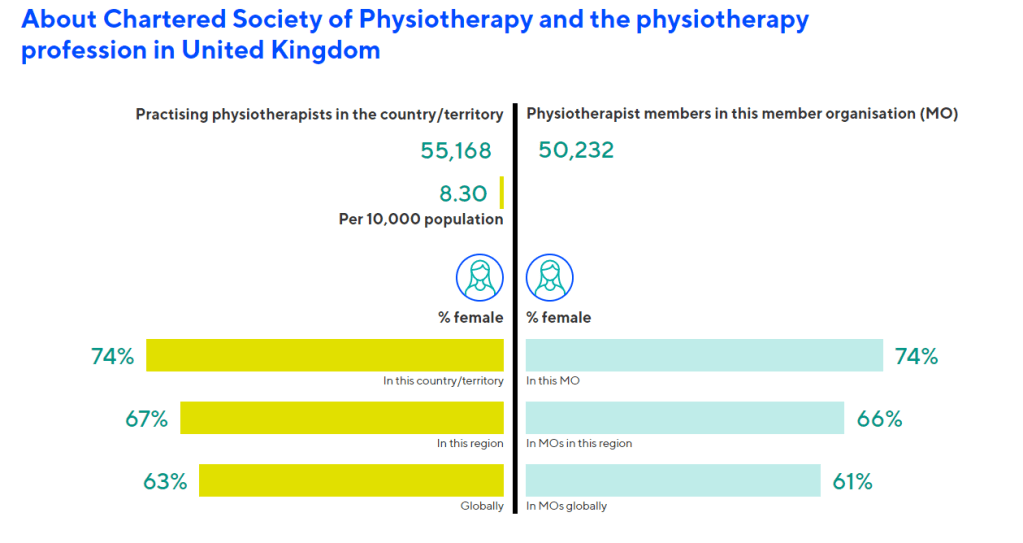 World Physiotherapy report on each of their member organisations gender balance and compare this to the regional and global proportion of male and female physiotherapists (the CSP has started to collect a wider range of data since 2019 including non binary gender data). The figures show that 74% of physiotherapists in the UK are female, compared to 66% regionally and 61% globally.
