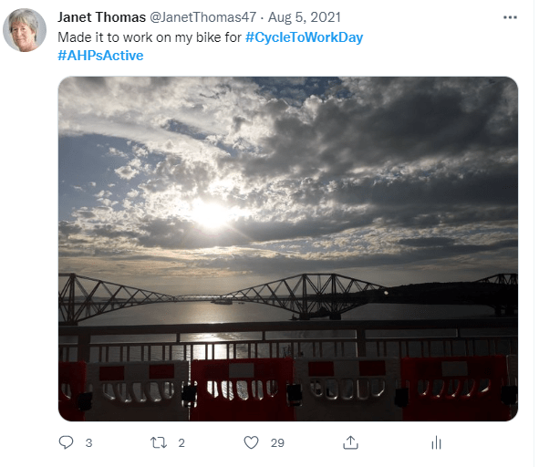 Last year I used Cycle to Work Day (which falls during #AHPsActive month) as the catalyst for my own start into active travel. I had never cycled to work before, and now I cycle once a week through rain, wind, occasional sunshine but not snow – I draw the line somewhere! Would I have done this without the double prod of #AHPsActive and noticing that it was Cycle To Work Day – I don’t know, but it certainly helped me on the way!