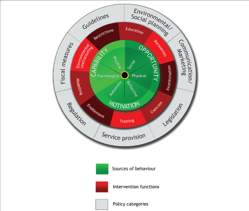 Michie S, Atkins L, West R. (2014) The Behaviour Change Wheel: A Guide to Designing Interventions. London: Silverback Publishing. http://www.behaviourchangewheel.com.